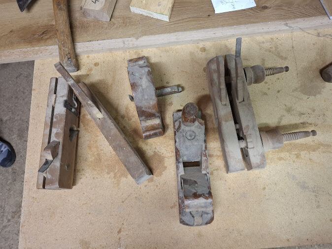 1.žaga za les – locn žaga, 2. kotnik – vinkl, 3. šestilo cirkle, 4. tesarska spona – klamfa, 5. tesarica, 6. tesarska sekira, cimermanka , 7. bobnarka